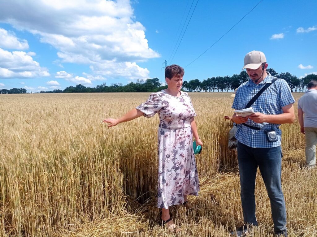 Огляд демонстраційних посівів сортів пшениці озимої провів Володимир Расевич, заступник директора Черкаської ДСДС, канд. с.-г.н., спільно з делегатами від оригінаторів – ННЦ «ІЗ НААН», МІП, СГІ НЦС, ІФРіГ. На полігоні представлено посіви восьми сортів пшениці озимої, із них один сорт твердої й сім – м’якої пшениці. Володимир Валентинович доповів щодо погодних умов 2024 сільськогосподарського року, звернув увагу на дуже суттєвий дефіцит опадів у регіоні, а також зупинився на технологічних прийомах збереження вологи в ґрунті, які дозволяють сформувати гарний урожай.